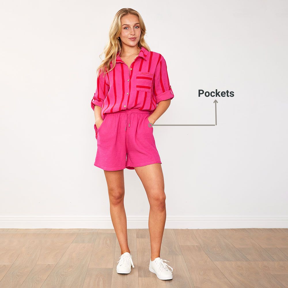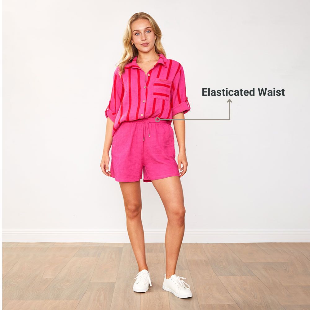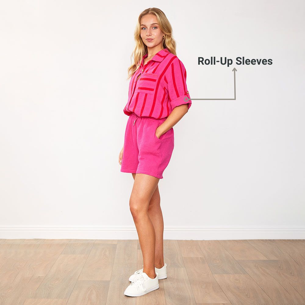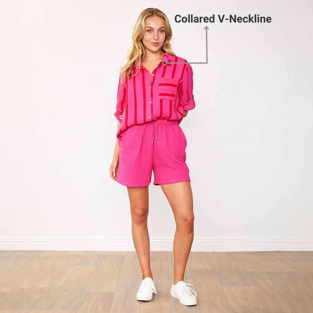 Effortlessly cool and ultra-comfy — this set features a collared V-neckline, button-front shirt, and roll-up sleeves for that laid-back polish. Paired with shorts featuring an elasticated waist, it's your go-to for easy style with zero fuss.
