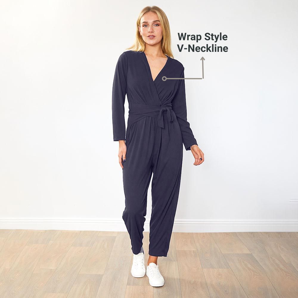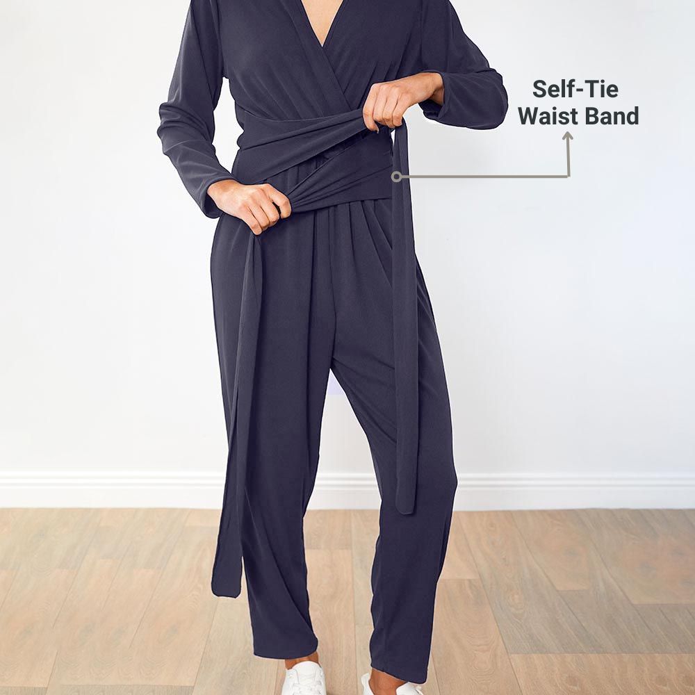 Own the moment in the Cliona Jumpsuit — where sleek meets effortless. The wrap style design frames your neckline to perfection, while the self-tie waist belt sculpts your shape just the way you like it. Long sleeves add that touch of polish, and the tapered leg fit keeps it chic from day to night. Confidence never looked this easy.