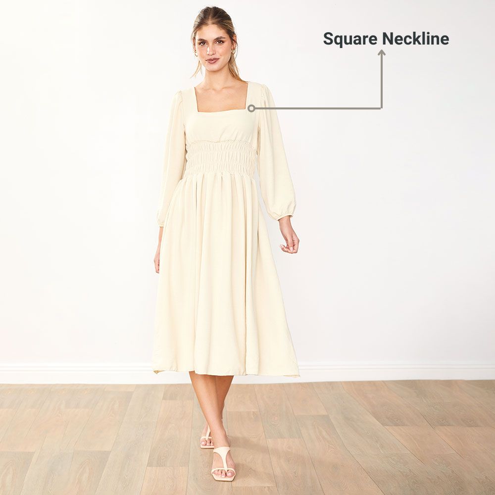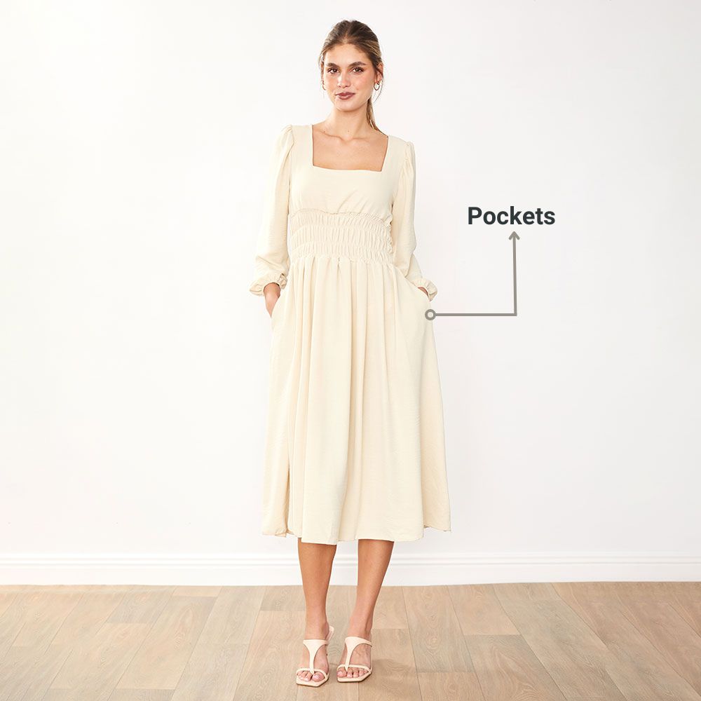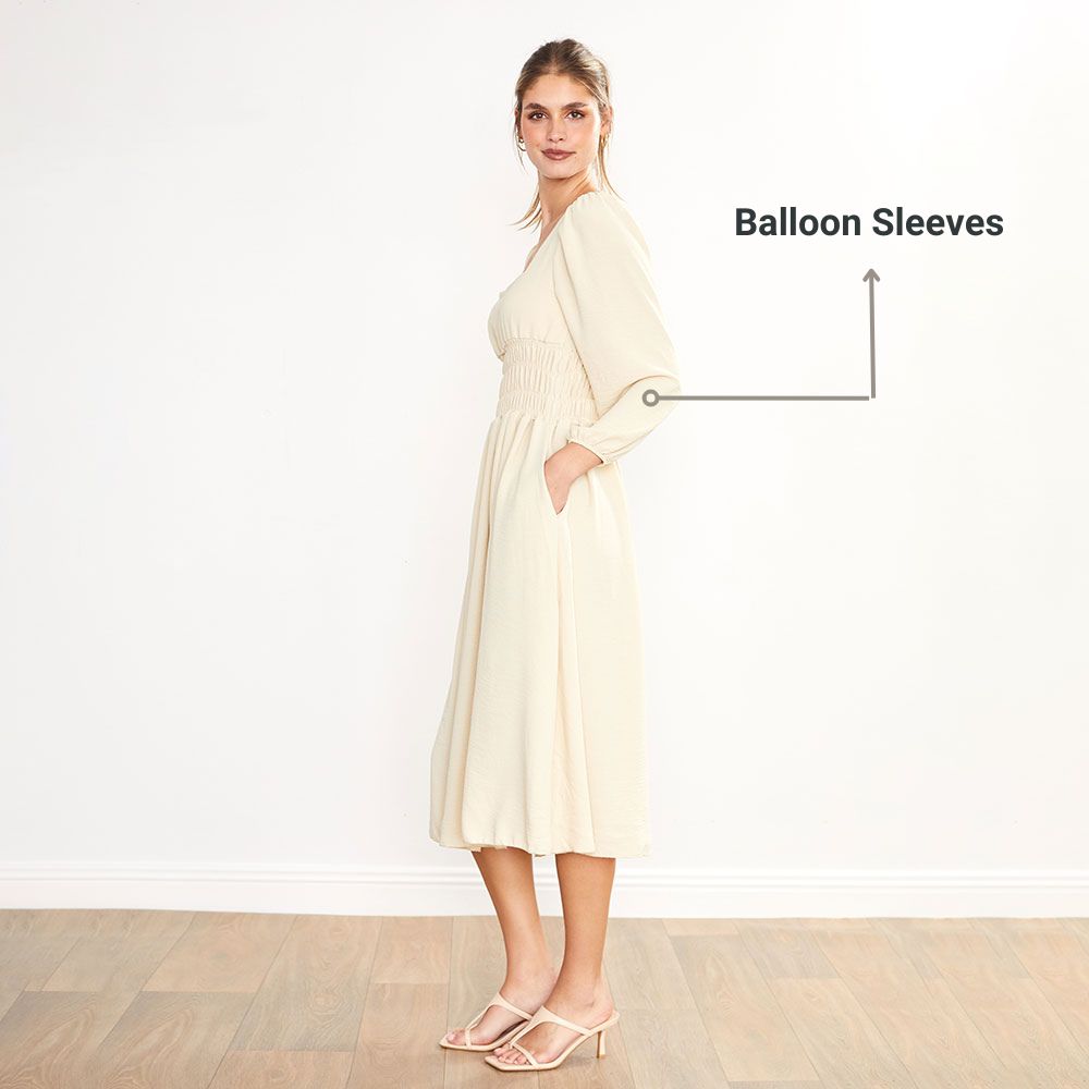 The Evelyn Dress is where timeless elegance meets everyday ease – with its square neckline, flattering shirred waist, and floaty balloon sleeves, it’s the dress that makes effortless chic feel natural.