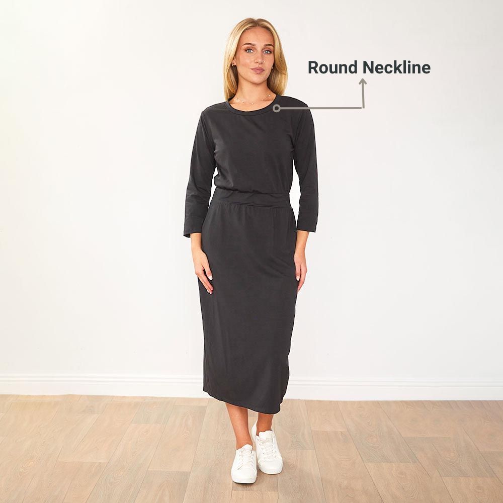 The Mara Dress is elegance without the effort. 🌸 A classic round neckline, relaxed silhouette, and cinched elastic waist create a flattering fit you’ll love. With 3/4 sleeves and practical pockets, it’s the easygoing dress that keeps chic on speed dial.