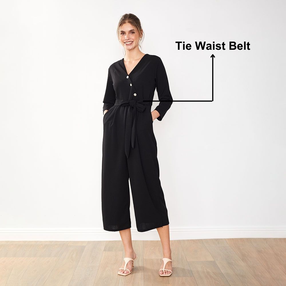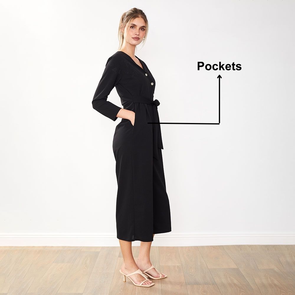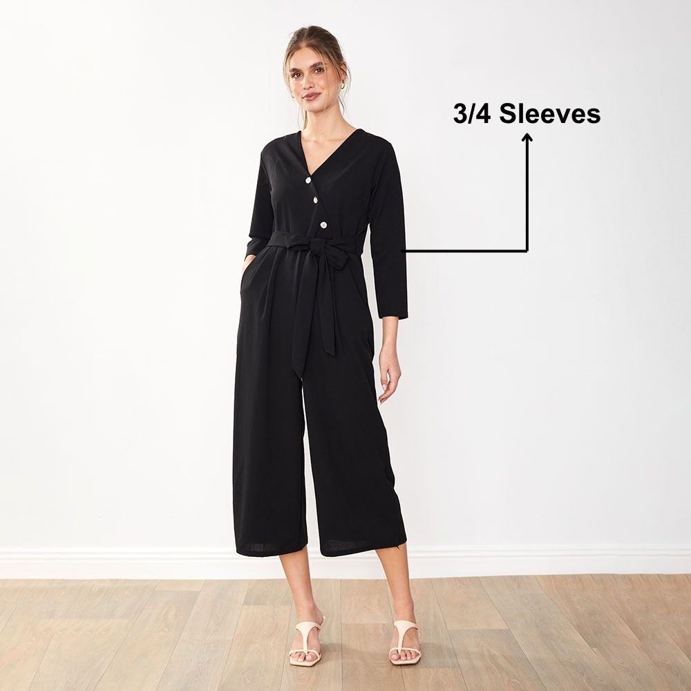 ✨ Effortless elegance in one piece! The Ruby Jumpsuit features a sleek V-neck, chic button-down detail, and a tie-waist belt for a flawless fit. With 3/4 sleeves, handy pockets, and a wide-leg design, it’s your go-to for desk-to-dinner style.